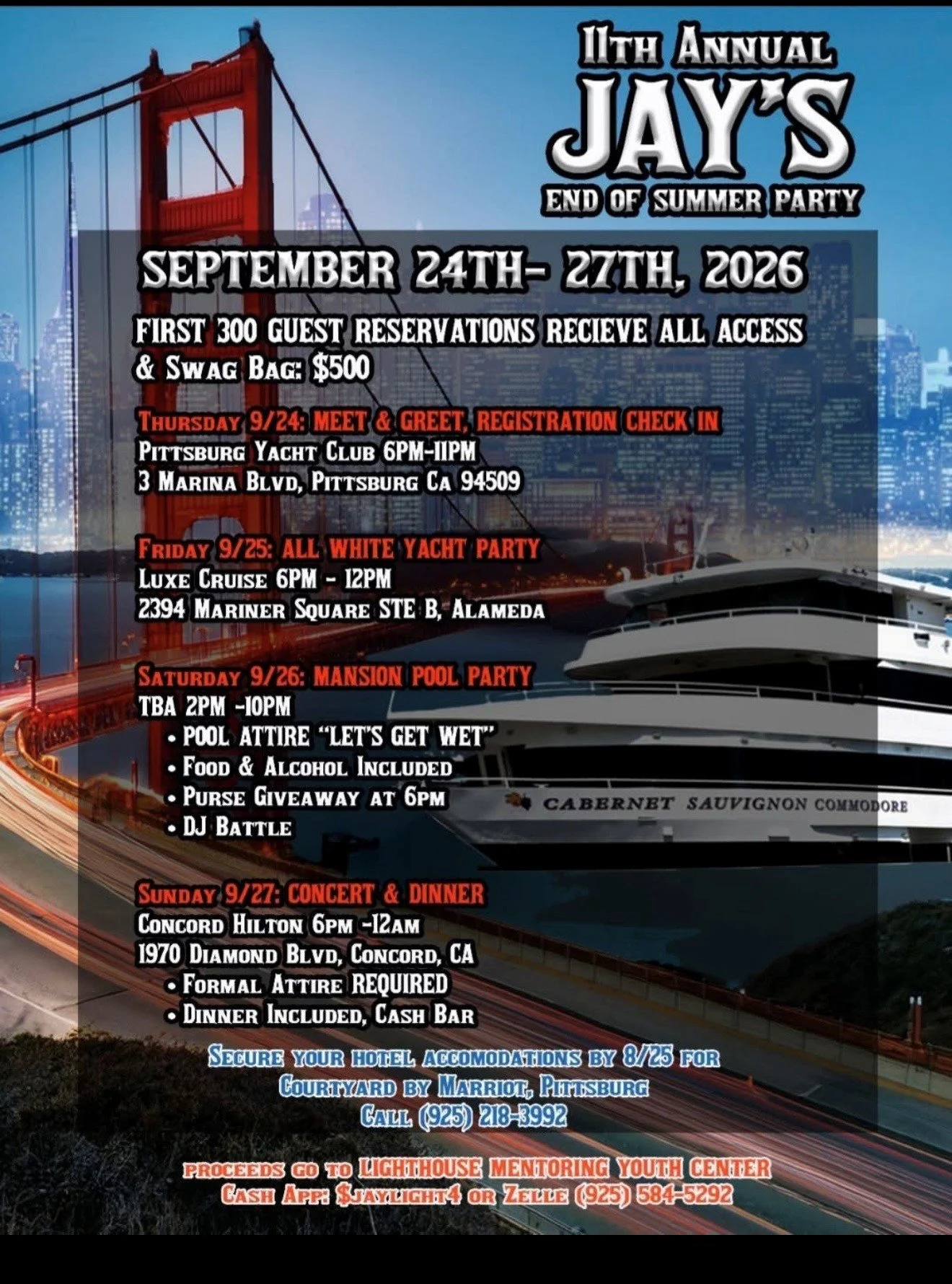 Join us for Jay’s 11th annual End of Summer Party -(JEOSP) Soul Fest in the San Francisco Bay Area! All proceeds go to Lighthouse Youth Mentoring Program!
